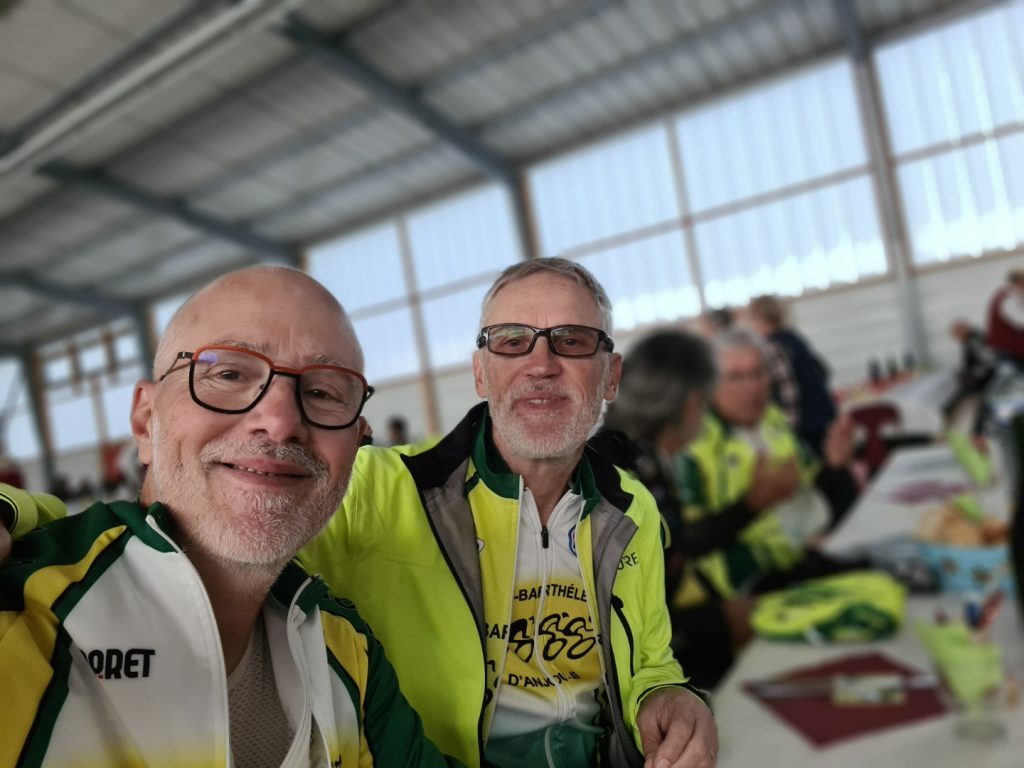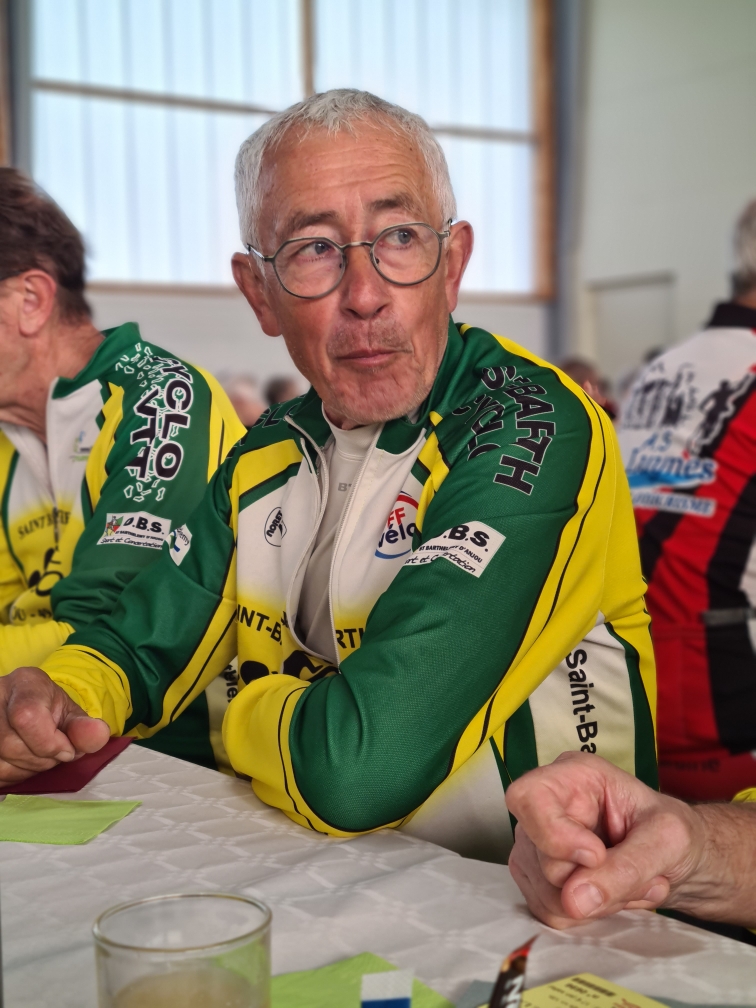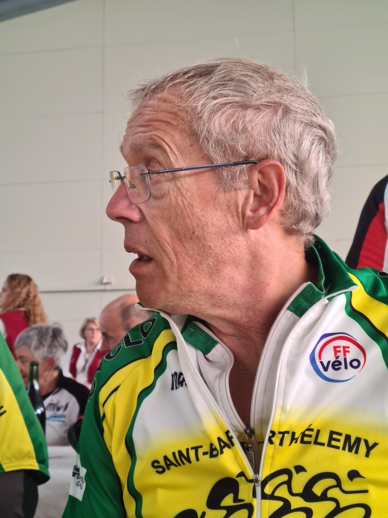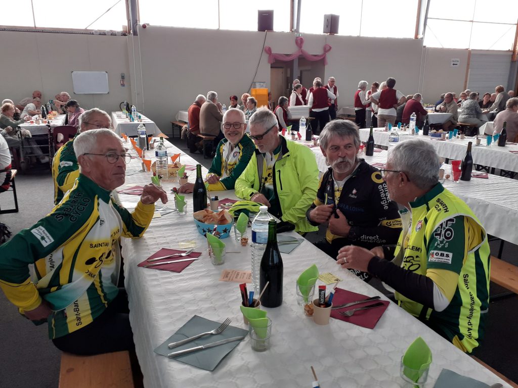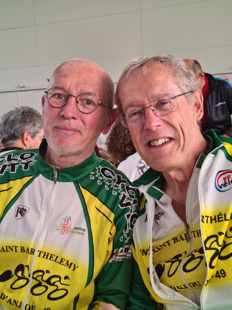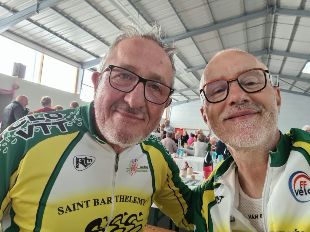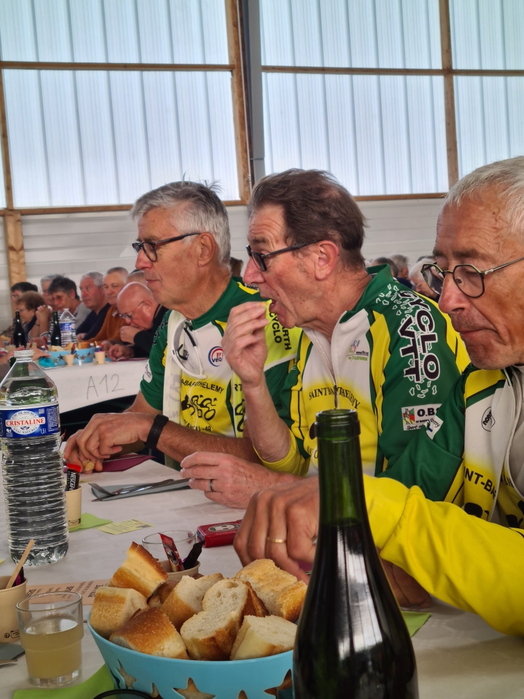 “Mercredi 8 octobre, départ 9 h tapantes, direction Vernantes (vers l’Est et non pas vers Nantes vers l´Ouest). 60 bornes peinardes par les petites routes, à midi nous y sommes. Apéro “Bernache”, repas de gala, dix cyclos bartholoméens parmi 750 convives.